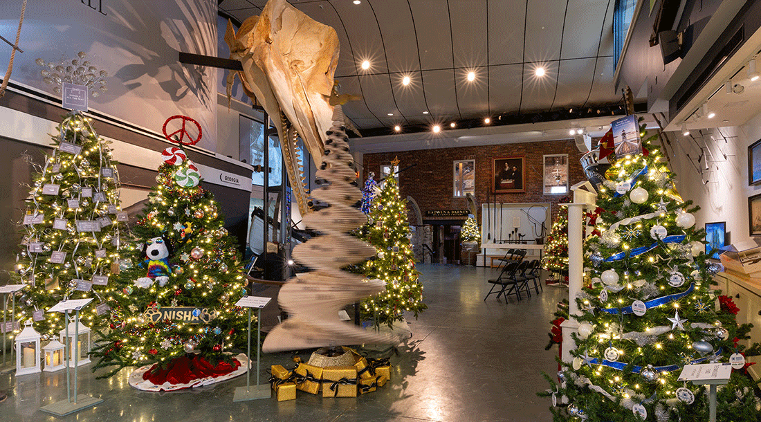 Each year, community members, local merchants, nonprofit organizations, artists, artisans, and schoolchildren design magnificent trees displayed in the Whaling Museum for visitors to enjoy throughout the season.