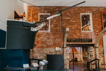 Anchored beneath the dramatic whale skeleton the diminutive 28-foot whaleboat evinces the dangers of hunting the largest creatures on earth. Ours is a whaling-era boat, built in the late 19th-century in New Bedford. Whaleboats were built to be light, fast and maneuverable. The boat is equipped for efficient sailing, with a tabernacle to raise a mast and a centerboard. The boat also contains the equipment typically carried in American whaleboats, with tubs of coiled line, harpoons, lances, piggin (bailing bucket), drogue, and a hatchet to cut the line if the whale sounds deeper than the line can go.