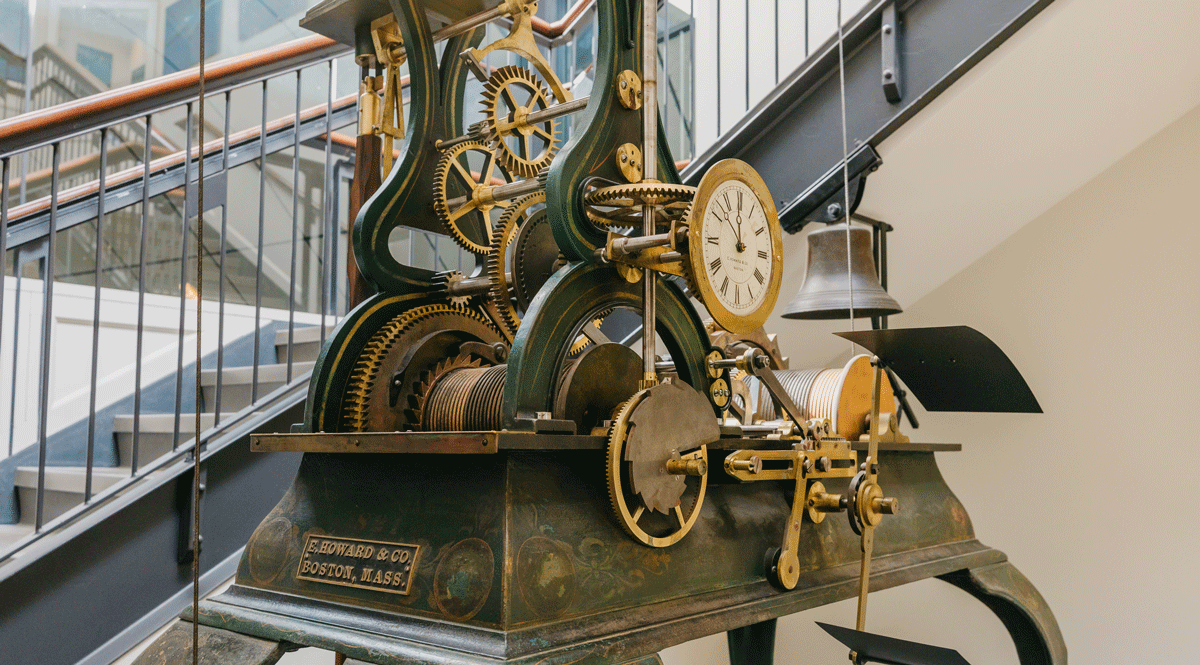 The Howard clock was donated by the Town to the NHA in April 1972 and was moved to the Peter Foulger Museum. It was restored in 2004–2005 to be installed in the glass-enclosed three-story stairwell of the Whaling Museum for its grand reopening in 2005, a location that displays the clock and its intricate mechanism in full view. Today, from the lobby to the museum’s rooftop belvedere, visitors can closely observe the clockworks chime the hours.