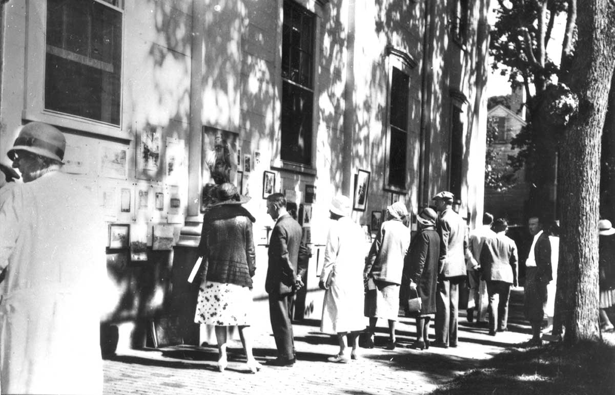 The Sidewalk Art Show was a phenomenal success. The Inquirer and Mirror credited it with being the first of its kind in the nation, and called Nantucket “the cradle of the movement which has brought art … to the ‘man on the street.’” In its first year, some three hundred people visited the exhibition, which included works by more than twenty painters. The Inquirer and Mirror reviewer wrote: “The wide shady walk by the library was an ideal place to examine and discuss Art and the beauty of Nantucket, which was the principal subject of the oil, water-color, black and white studies displayed. Little children, tourists, sailors, townspeople came again and again, eagerly examining the varied aspects of the Island, and deciding which was truest to life.”